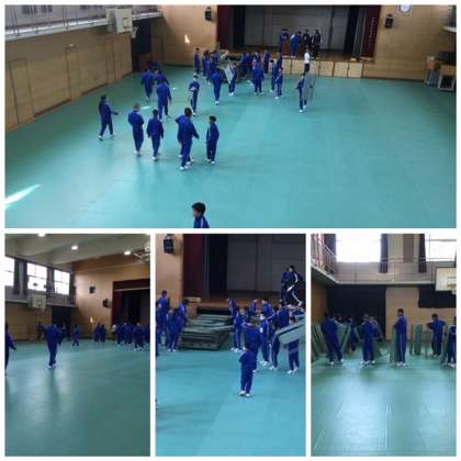 新2年生が、朝から式場の体育館だけでなく、校舎周りや新入生の教室まで清掃、準備をしてくれました。明日の入学式は、午前9時半から体育館で行います。新入生のクラス発表は、午前8時50分。そして、集合は午前9時です。新2年生は、午前8時20分までに登校してください。
