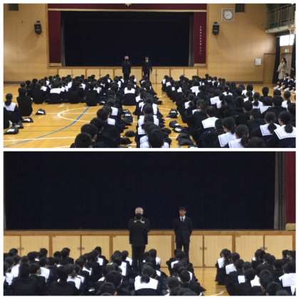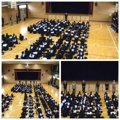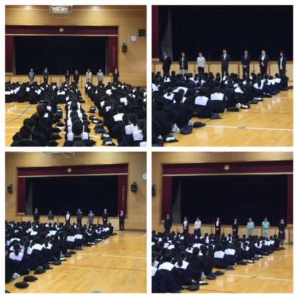 H30年度 始業式が行われました。はじめに春休みの部活動の賞状伝達を行いました。卓球部が、ブロック大会で優秀な成績をおさめました。続いて、着任式が行われました。本年度本校に着任された先生の紹介の後、校長先生からお話を聞きました。年度初めにあたり、電車の中での様子をお話され、人の中で生きていくためには、自分以外の人を意識して、気遣いができる人。そして、自分の意思を伝えられるコミュニケーションを大切にしてほしいというお話でした。生徒主事の泉原先生からは、中学生としての心得をお話していただきました。校長先生から、続いて、学年の先生方の紹介がありました。