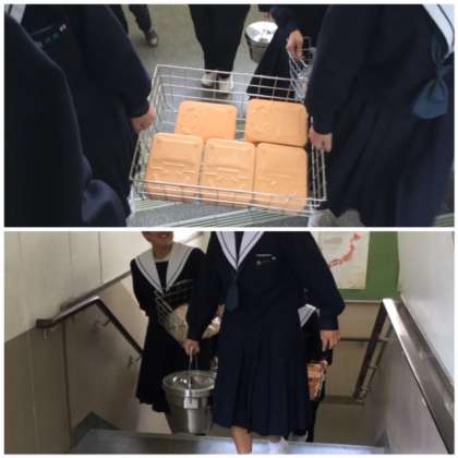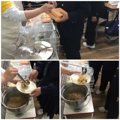 今年度の2学期から親子給食に移行しますので、2年生では、その時に備えて、配膳室から生徒たちが当番で教室まで運んでくる、教室まで運んだ給食をそれぞれが取りに来る、食缶のおかずを取り分けてもらうなどを始めています。
