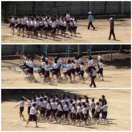 午後、二年生は運動会の練習をしました。行進の練習では、体育委員が中心になり、自分のクラスの行進に対して、気づいた点を呼びかけていました。