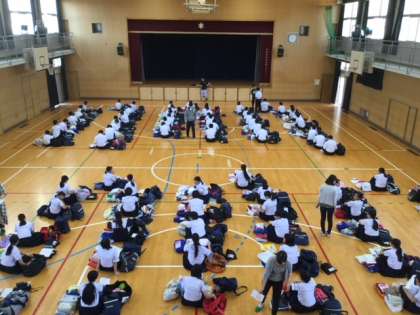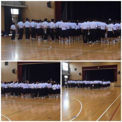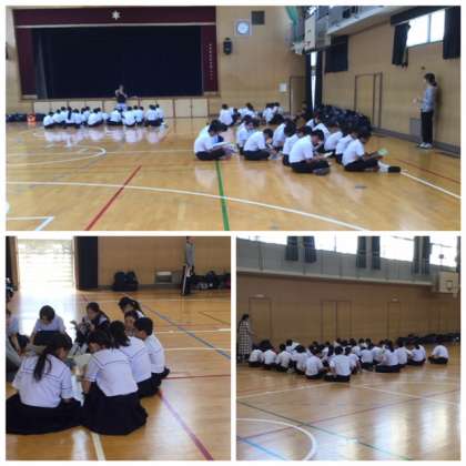 27日(日)、明日からの修学旅行に向けて、みんなで確認をしました。まず、持ち物の確認です。「タオルはありますか」持ち物がカバンの中に入っているかの確認をしました。そして、次に、行動の確認をしました。体験別に乗車バスが違ったり、係り別に行動が違ったりします。それらの確認をしました。