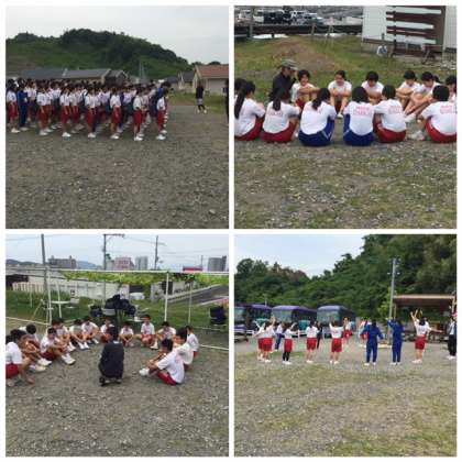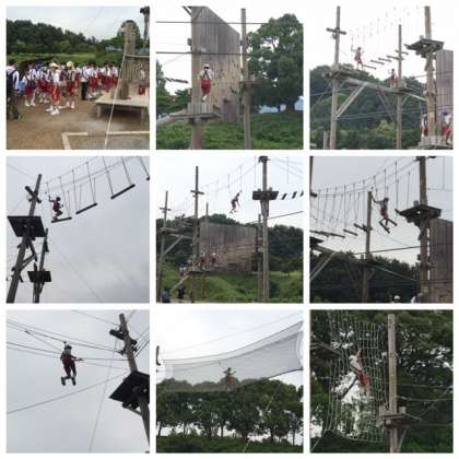 彦根スカイアドベンチャーに到着。クラスごとにローエレメントー地上での取り組みーとハイエレメントー10mの高さでのパフォーマスーに取り組み始めました。
