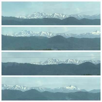 途中雪を頂いた山を見ながらラフティング基地に到着。いよいよラフティングです。着替えて、装備を持って準備します。