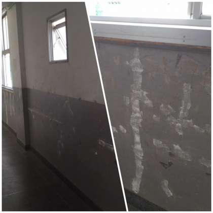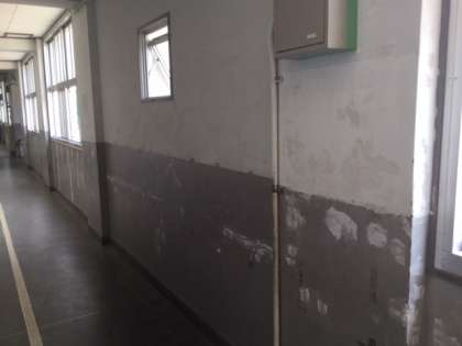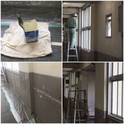 昨年度、南館の外壁塗装工事が済んだのですが、廊下の壁の塗装が剥がれ落ちている部分もあったため、管理作業員さんが2階廊下の壁塗装をしてくれています。