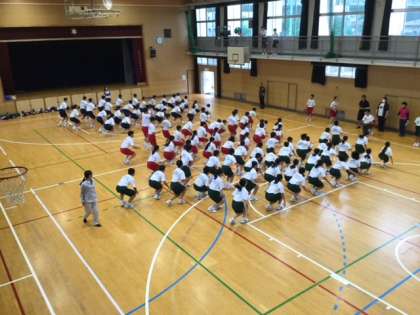 雨天のため、体育館や格技室、ピロティーを使っての応援練習を行いました。