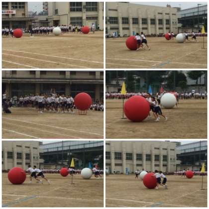 初めての運動会で1年生の団体競技綱引き。2年生は大玉ころがしを行いました。