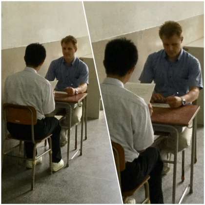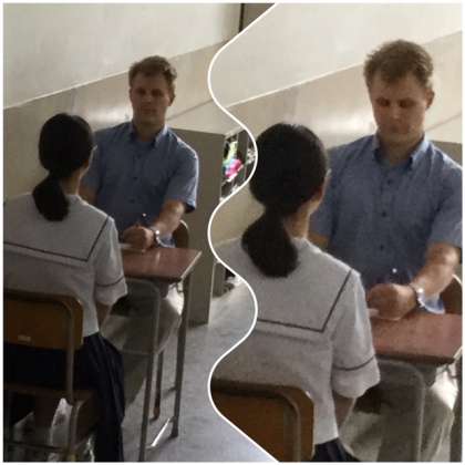 1組の廊下で、C−NETのブライアン先生が、生徒と面談をしていました。聞くと、生徒は英語を話し、ブライアン先生から英語で質問を受けていました。教科書の本文を先生に話し、その内容に応じた質問を受けて答えるというパフォーマンステストをしていました。