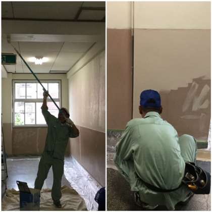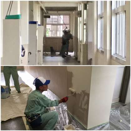 南館の廊下の塗装は、以前から管理作業員さんによって進められています。今日は、2階のトイレ前の廊下仕上げの塗装です。湿気がいっぱいで高温の中での作業をしてくださっています。
