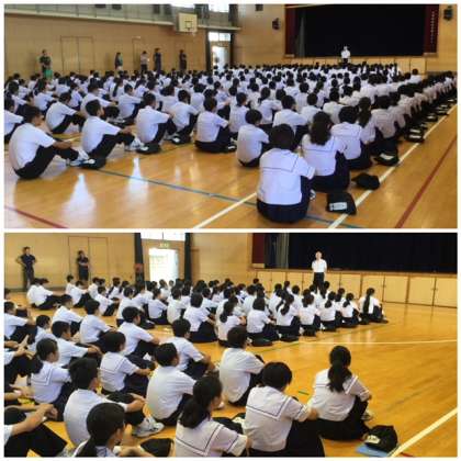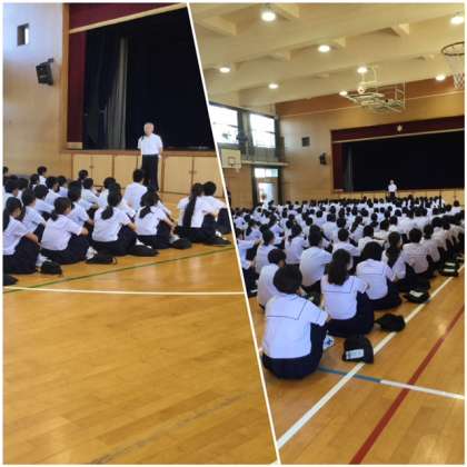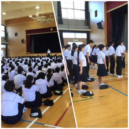 全校集会が行われ、一か月のうちに、大きな地震や大雨により自然災害が続きました。多くの人たちたちが犠牲になりましたが、決して他人ごとではなく、大きな被害にあうかもしれません。地震なら、まず頭の保護、自分の安全確保。津波なら高いところに避難。しかし、大雨による被害は、近くの避難場所に避難することですが、場合によってはどの道で逃げるのがよいのか、分からないときがあります。状況に応じて判断できる力が必要になってきます。また、日ごろから緊急避難用の物資も準備しておくことも大切です。校長先生からは、このような話がありました。