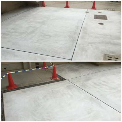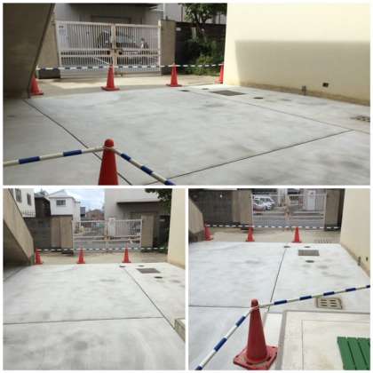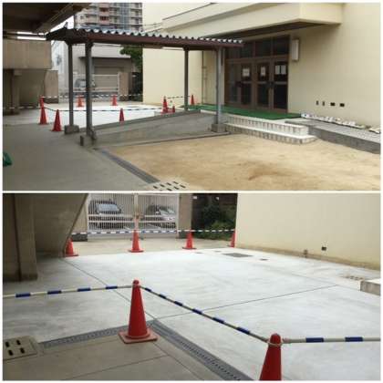 2学期から、親子給食が始まります。粉浜小学校で作っていただき、給食は本校に運搬されます。搬入路は、南門(体育館横)ですが、雨天時は水たまりができるなどしていたため搬入路整備のため南門付近をコンクリート打ちをしました。閉庁日の間養生していました。