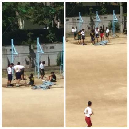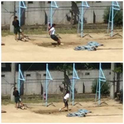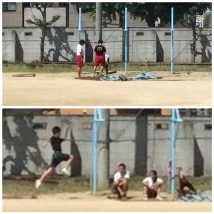 カラッとしたお天気になりましたが、陽の光は強く、気温は高いままです。その中で、陸ジョブが練習をしていました。走り幅跳びの練習をしていました。