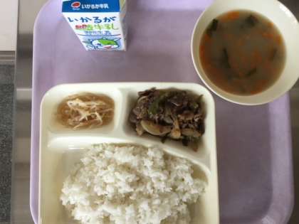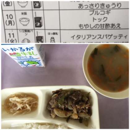 本日の献立は、プルコギ、トック、もやしの甘酢あえでした。