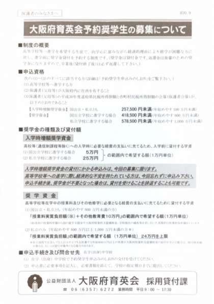 募集プリント ☞ 大阪府育英会予約奨学生の募集について