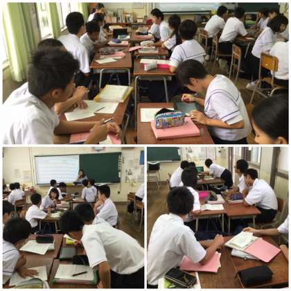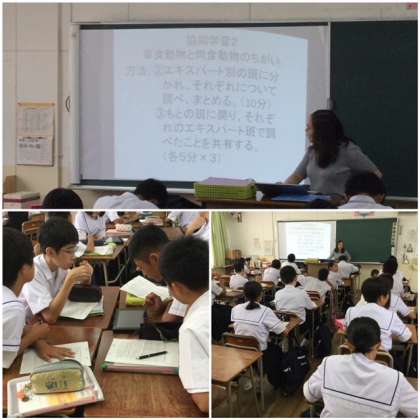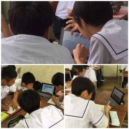 1限目、2年2組の理科の授業の様子です。「草食動物と肉食動物の違い」についての調べ学習です。各班に1台のタブレットが配られて、与えられた箇所をタブレットで調べてまとめます。