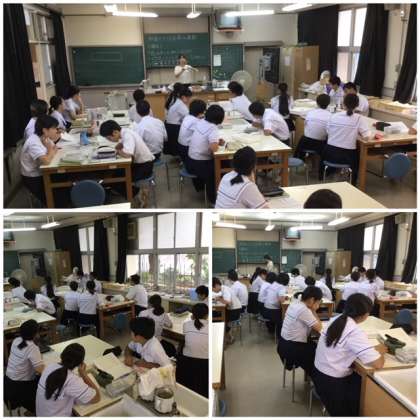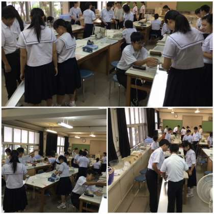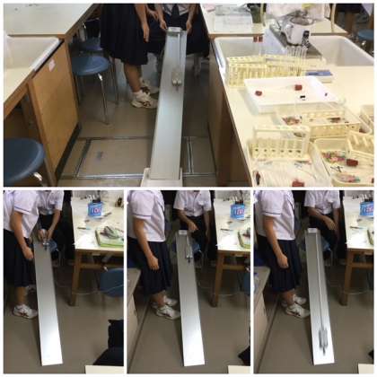 1限、3年2組は理科の授業です。理科室で、「斜面上での台車の運動」についての学習でした。タイマーを使い、0.1秒に1回打刻することを利用して、斜面上での台車の動きを観察する実験です。