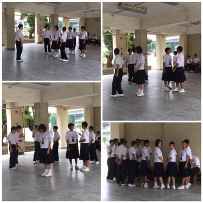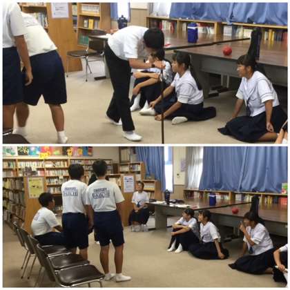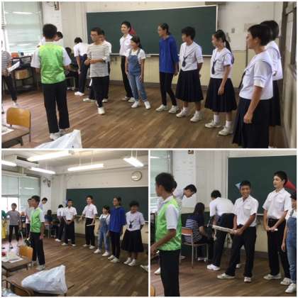 教室やピロティなどを使ってクラスごとの演劇の練習をしています。各教室では、大道具、小道具も作成中です。(写真上から、1組、2組、3組です)