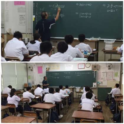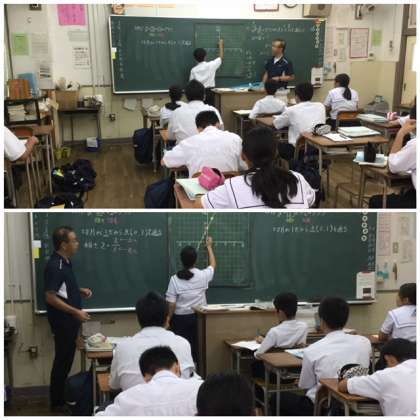 6限目、数学の授業がありました。2年1組の生徒を分割して、少人数による授業です。関数とグラフの学習です。ていねいに前時の復習をしてもらい、本時の学習に進みました。理解できたかどうかを、確かめながら進めてもらっていました。