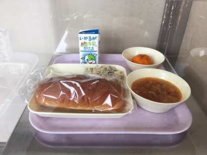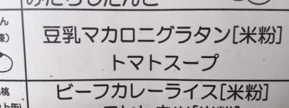 本日の献立は、豆乳マカロニグラタン(米粉)、トマトスープ、みかん(冷)です。