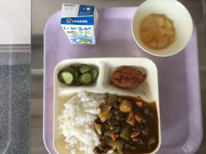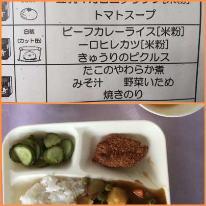 本日の献立は、ビーフカレー(米粉)、一口ヒレカツ(米粉)、きゅうりのピクルス、白桃(カット缶)です。