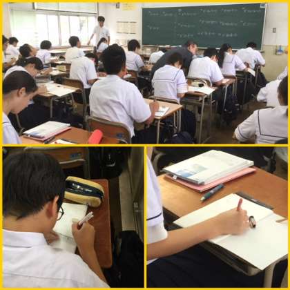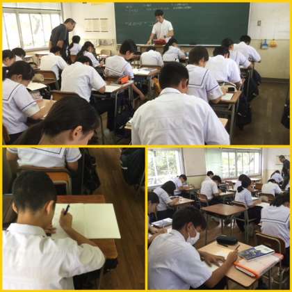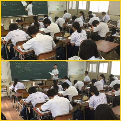 2限、3年2組は数学の授業です。先生が二人入っていて、きめ細かな指導。今日は因数分解の学習。授業初めの10分ほどは今までの復習問題を解き、そのあと、因数分解の演習。たくさんの問題を解きました。