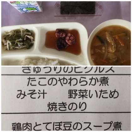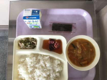 本日の献立は、タコの柔らか煮、みそ汁、野菜炒め、焼き海苔です。なお、28日(金)は文化祭ですが、給食はありません。10月1日(月)は親校である粉浜小学校が運動会の代休のため本校の給食はありません。9月28日(金)と10月1日(月)の2回、給食がありませんので、お弁当を用意してください。