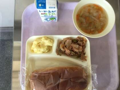 本日の献立は、豚肉と野菜のケチャップソテー、スープ、スイートポテトです。