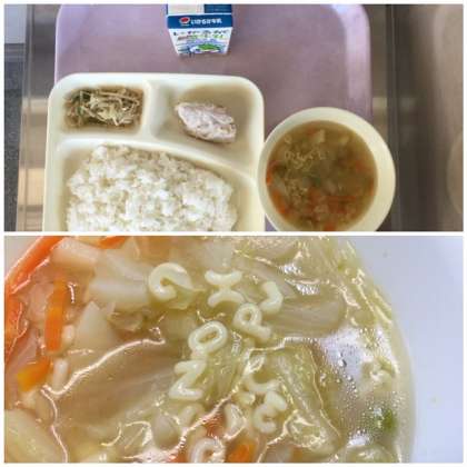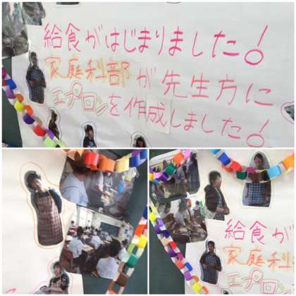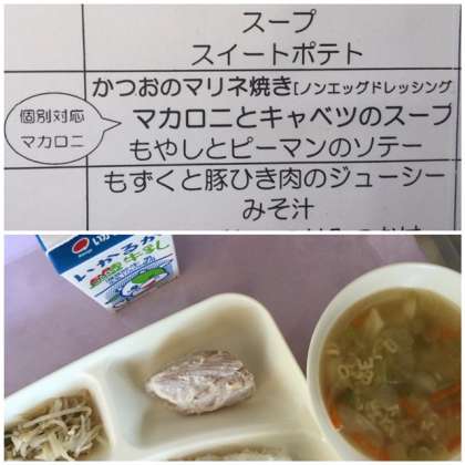 本日の献立は、かつおのマリネ焼き(ノンエッグドレッシング)、マカロニとキャベツのスープ(マカロニ)、もやしとピーマンのソテーです。マカロニは、アルファベットをかたどっていました。また、給食配膳時に先生方が身に着けているエプロンは、家庭科部のみなさんの製作です。(被服室に掲示してありました)