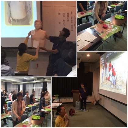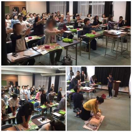 そのあと胸部圧迫とAEDの実地研修を行いました。遅くまで、たくさんの方が熱心に参加していただきました。