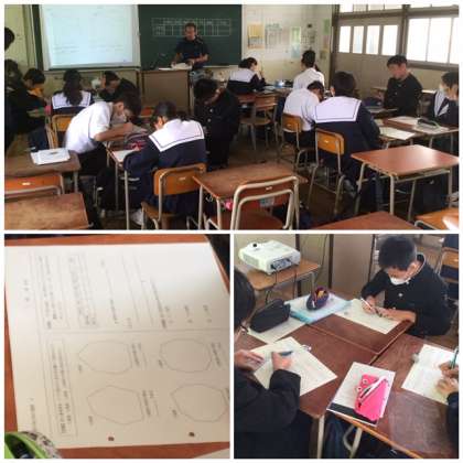 1限、2年3組で数学の授業がおこなわれました。図形についての最初の授業です。苦手な人が多いようですが、基本的なことから学んでいきましょう。今日は、多角形の内角の和について、班ごとに分かれて学習をしました。