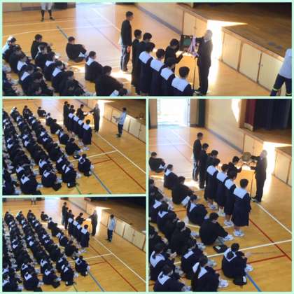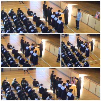 また、男女ハンドボール部が大阪市の秋季総体で、ともに優勝をし、賞状や盾、メダルなどを伝達しました。
