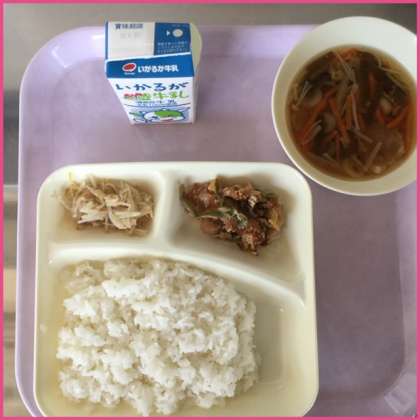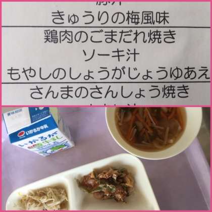 本日の献立は、鶏肉のごまだれ焼き、ソーキ汁、もやしのしょうがじょうゆあえです。