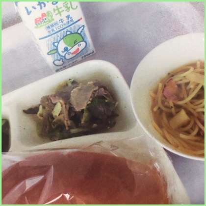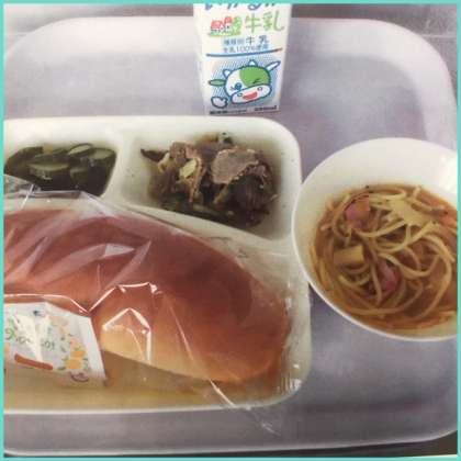 本日の献立は、牛肉のカレー風味焼き、トマトのスープスパゲッティ、キュウリのサラダです。