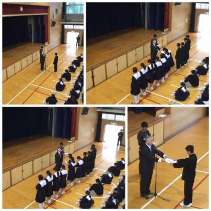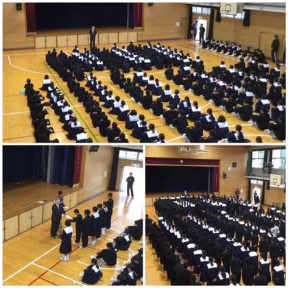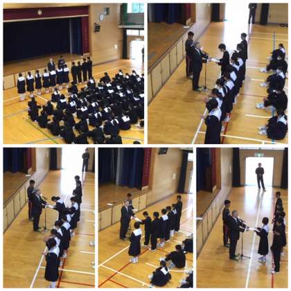 1年生の松山君は、夏季のJOC水泳大会全国大会でメドレーリレーは優勝、フリーリレーは第2位という素晴らしい結果を出しました。その成果を称え、賞状伝達を行いました。そして、本年度後期生徒会執行委員の認証式がありました。選ばれた責任をきっと果たしてくれると思いますが、いつも伝えているように、選んだ人たちの協力がなければ、責任は果たせません。自分の所属する集団次第で、自分への影響は変わります。みんなで協力をして、今以上の住吉第一中学校になるように、代表者の人たちへ協力をしてほしいというお話を校長先生からありました。