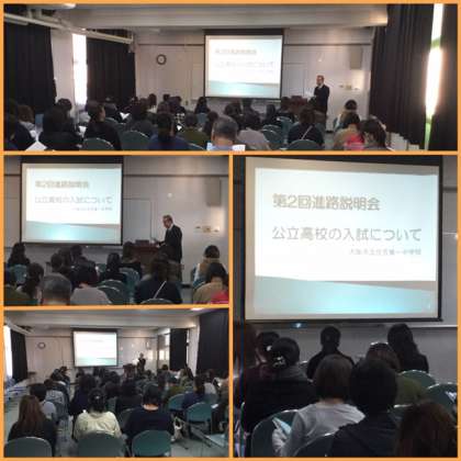 続いて、大阪府立大阪府教育センター附属高校の先生から公立高校普通科単位制についてお話をしていただきました。加えて、各校の特色についてもご説明いただきました。3校の先生方お世話になり、ありがとうございました。最後に、進路主事から「進路の手引き」について要点を説明させていただきました。12日より始まる3年生進路懇談にお役立ていただけたらと思います。
