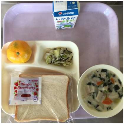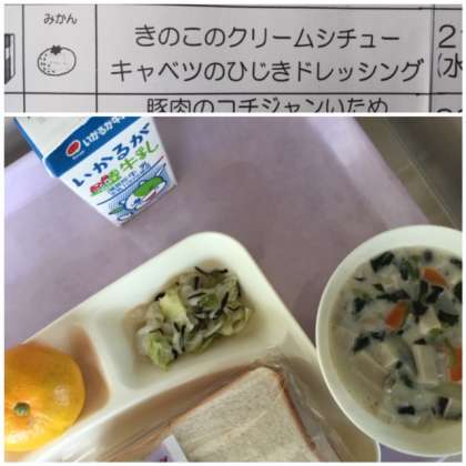 本日の献立は、きのこのクリームシチュー、キャベツのひじきドレッシング、みかんです。