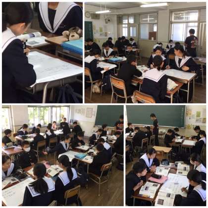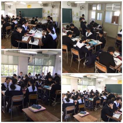 1限、国語の授業では、メディアリテラシーについての学習をしていました。「富士山の山開き」の様子の新聞記事を読み比べて、意見交換をし、まとめて発表するという学習です。