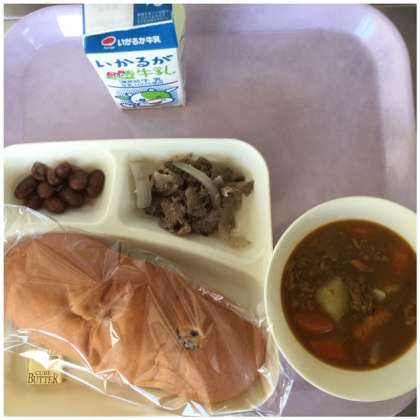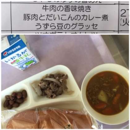 本日の献立は、牛肉の香味焼き、豚肉とだいこんのカレー煮、ウズラ豆のグラッセです。