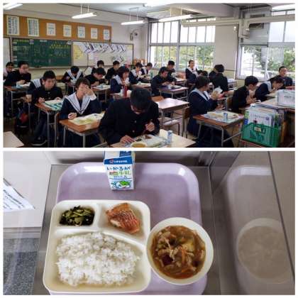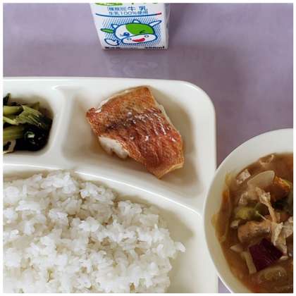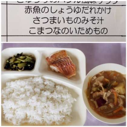 本日の献立は、赤魚のしょうゆだれかけ、さつまいものみそ汁、こまつなのいためものです。3年生は準備が早く済み、いつもより余裕を持って食べることができました。