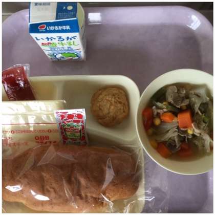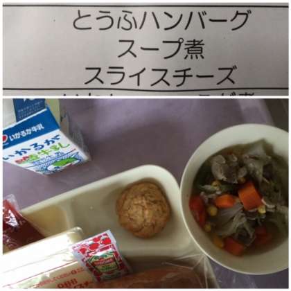 本日の献立は、とうふハンバーグ、スープ煮、スライスチーズです。