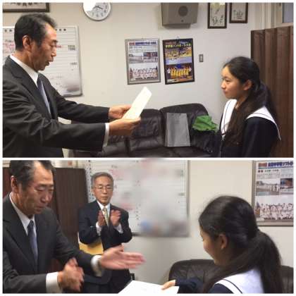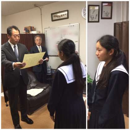 4日、「税の作文」の表彰式が校長式でありました。1組の牧田さんが「住吉・住之江地区租税教育推進協議会長賞」に選ばれ、住吉税務署長の小畑さんが自ら校長室にお越しいただき、牧田さんに表彰状を贈っていただきました。住吉区・住之江区の中学校19校、2100点の中から選ばれたそうです。おめでとう、牧田さん。全校朝礼で賞状伝達をおこないます。