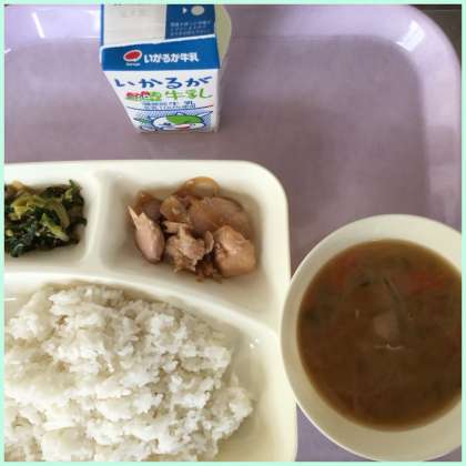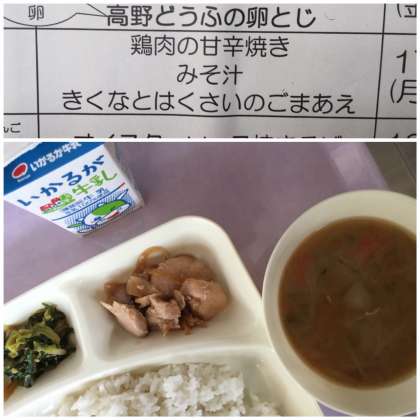 本日の献立は、鶏肉の甘辛焼き、みそ汁、きくなとはくさいのごまあえです。