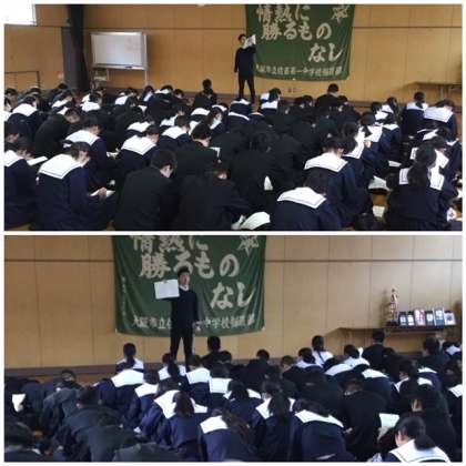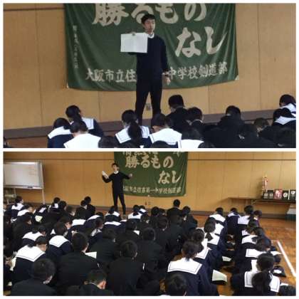 6限、3年生は格技室で、進路学習がありました。学期末に進路懇談が済み、受検する学校が決まれば、冬休み中にも入学願書などの書類を入手することになります。その書類の記入に際して、注意しなければならないことを宮川先生から説明を受けました。みなさん、真剣に聞いていました。