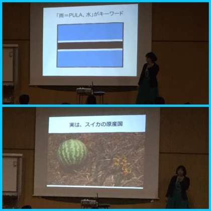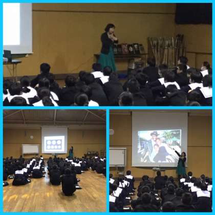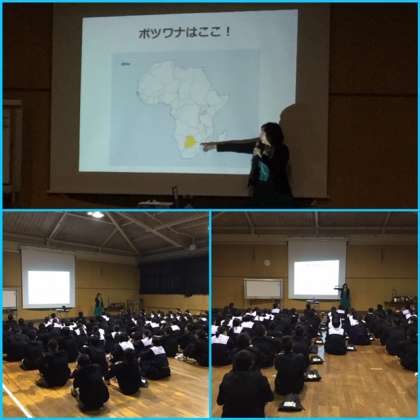 2年生は、格技室で、アフリカのボツワナで活動をしておられた講師の先生のお話を聞きました。ボツワナという国の紹介や気候、自然についての授業でした。