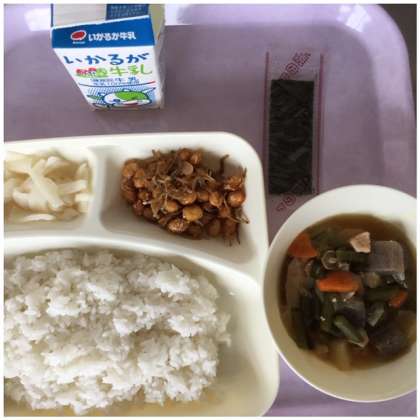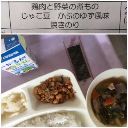 本日の献立は、鶏肉と野菜の煮もの、じゃこ豆 かぶのゆず風味、焼き海苔です。