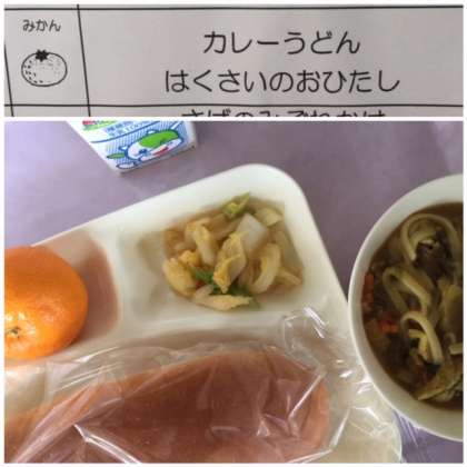 本日の献立は、カレーうどん、はくさいのおひたしです。