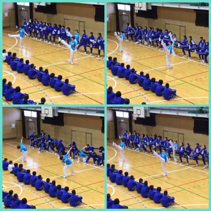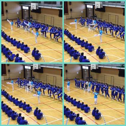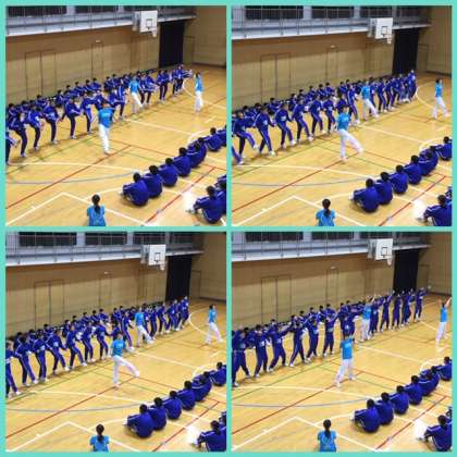 全体で振付を教わります。各クラスの男子、女子のそれぞれのグループでラインダンスの練習をし、最後はグループごとに決めのポーズで終わります。
