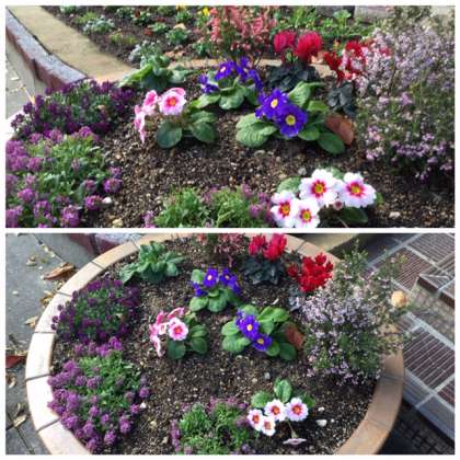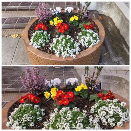 冬を迎え、玄関の花も模様がえです。きれいな花が並んでいます。管理作業員さんが整備してくれました。