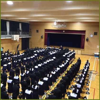 雨上がりのため、体育館で全校朝礼が行われました。校長先生から「本校北館校舎は約60年になり、老朽化したための建て替え工事を行います。それに伴って、グランドに仮設校舎を作ることになり、今日から業者の人たちが入って工事が始まります。長年、先輩方も親しんできた北館校舎です。あと少しの間ですが、感謝の気持ちを持って過ごしてください。」というお話がありました。
