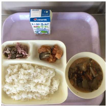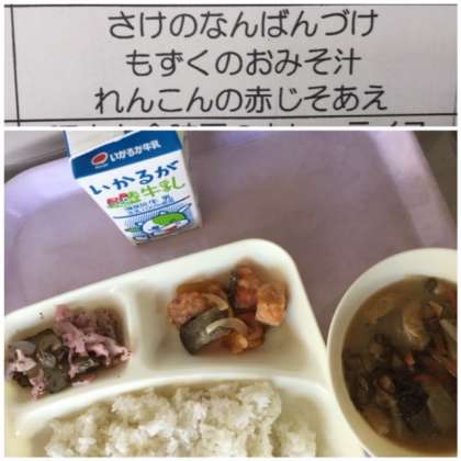 本日の献立は、さけのなんばんづけ、もずくのおみそ汁、れんこんの赤じそあえです。