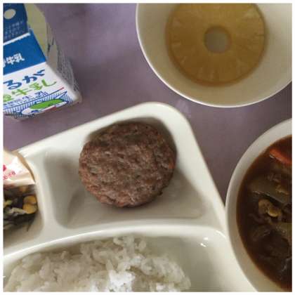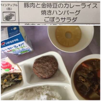 本日の献立は、豚肉と金時豆のカレーライス、焼きハンバーグ、ゴボウサラダ、パイナップルです。